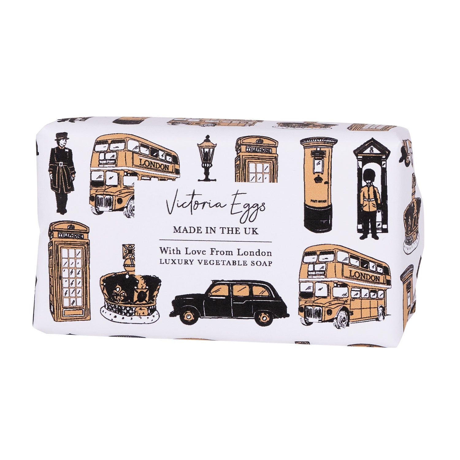 Experience the best of both worlds with the 'City of London' soap bar from Victoria Eggs - a harmonious combination of nostalgia and luxurious skincare. Infused with pure vegetable oils and enriched with shea butter, this vegan-friendly bar keeps your skin nourished and healthy. Adorned with London's iconic symbols, from black cabs to Queen's Guards, and wrapped in textured paper as a beautiful keepsake. Treat yourself to the frosty floral fragrance, featuring lilac flowers, ylang, rose, and muguet with a base of musks, vanilla, and blond woods. Made in England, this soap bar is a perfect addition to any bathroom or an ideal gift for someone special.