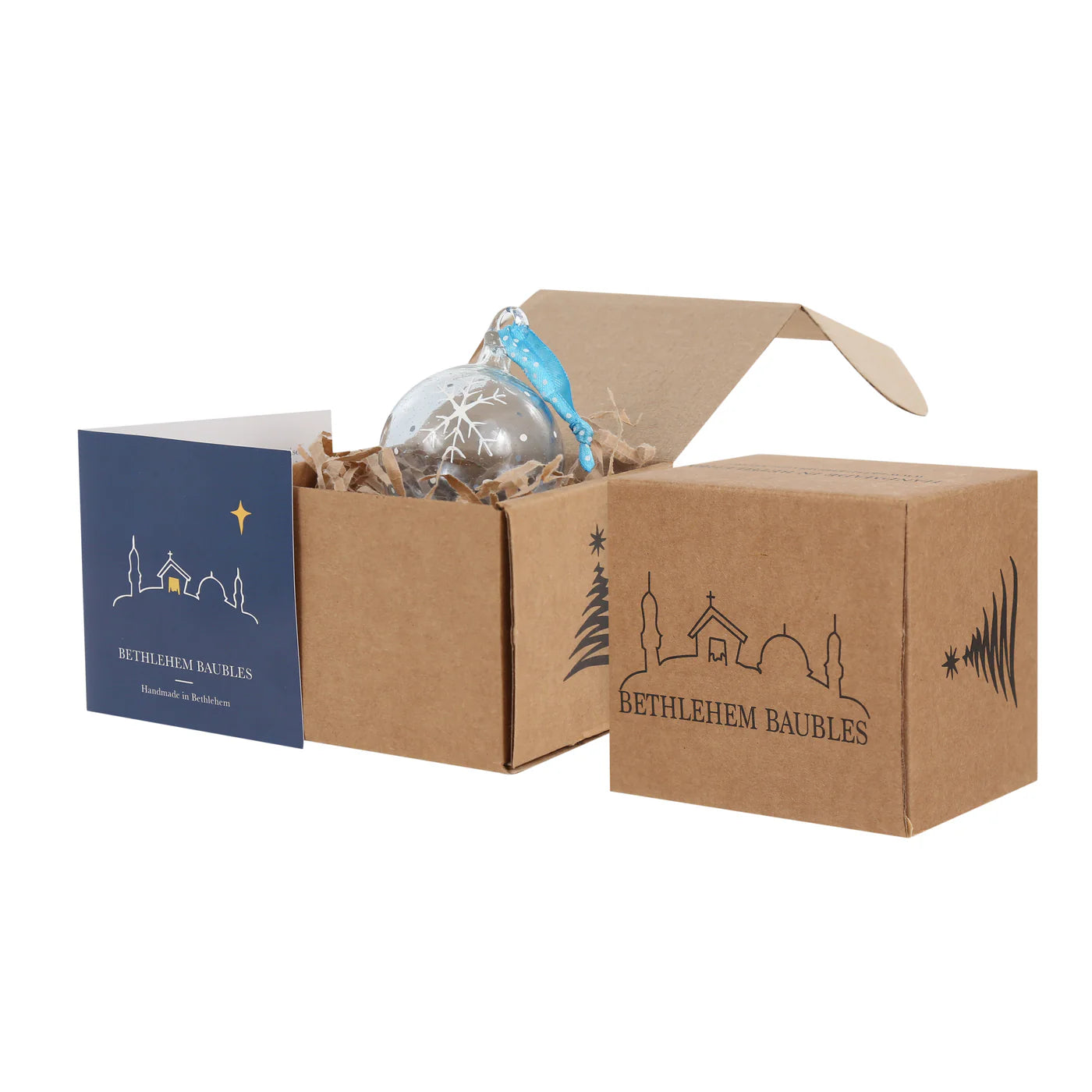 Celebrate the season with these beautifully handcrafted Ice Blue Glass Baubles from Bethlehem Baubles, available in two timeless designs — Blue Snowflake and White Snowflake.