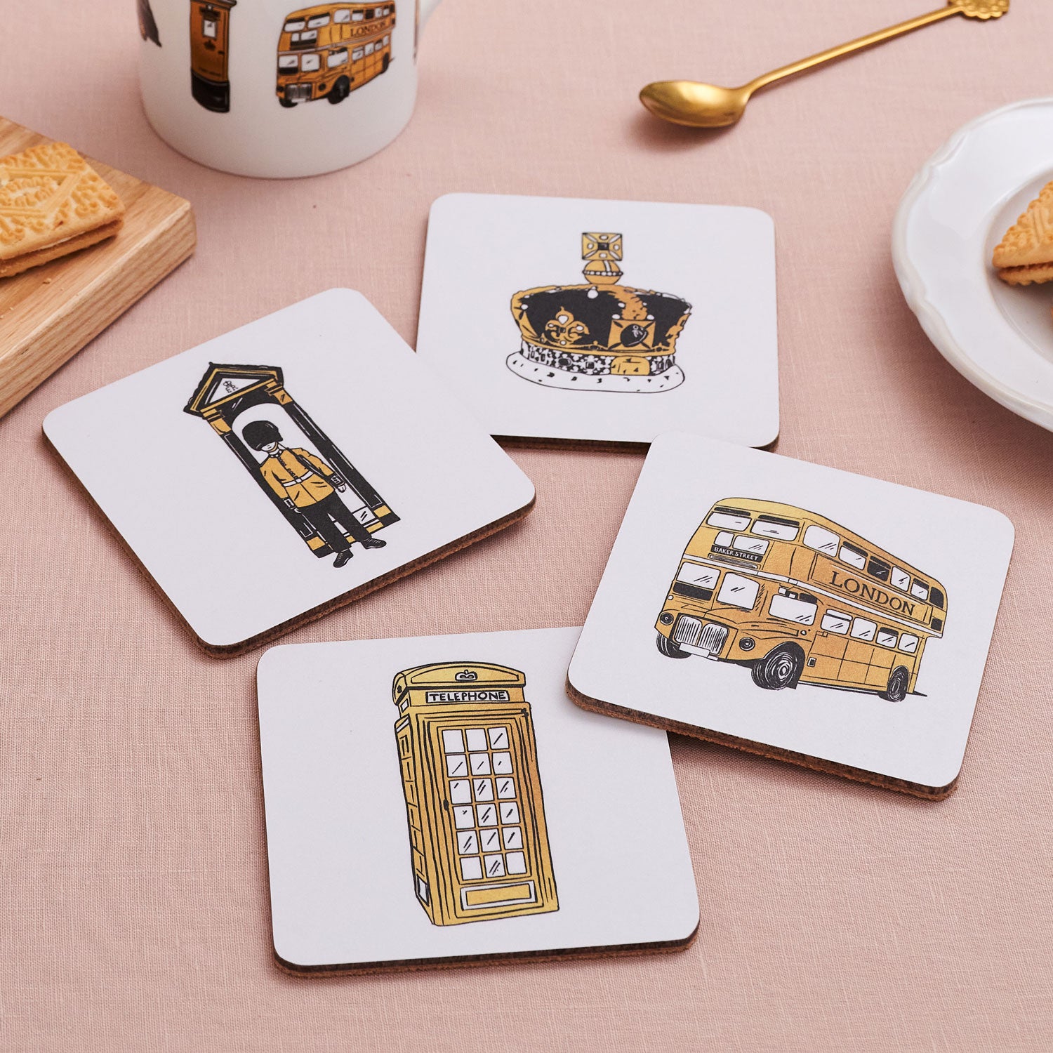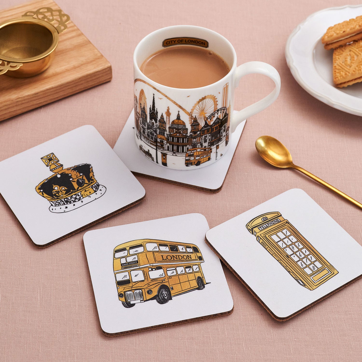 Delve into your favourite city with Victoria Eggs' London Icons Coasters - a set of 4 exquisite coasters featuring iconic images that truly capture the essence of the capital. Crafted in Britain with eucalyptus board and a matte laminate finish, each coaster is finished with elegant gold and black designs and a cork back for a sophisticated touch.
