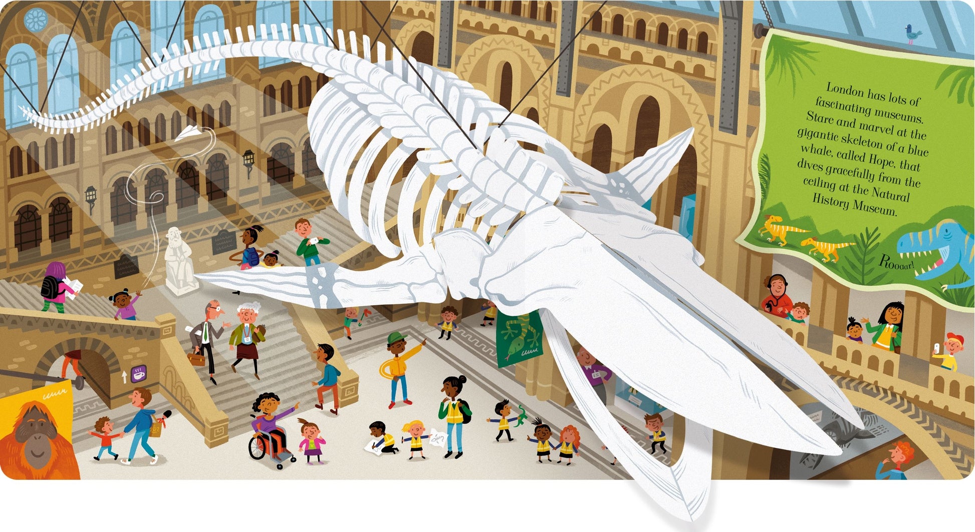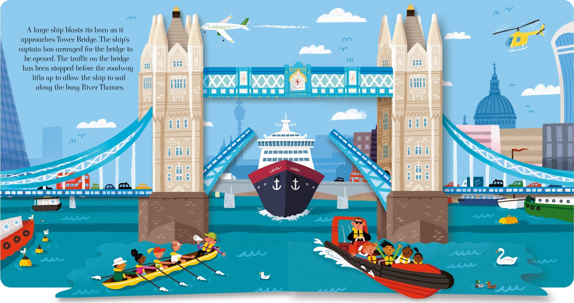 Explore the city of London in this delightful pop-up book with detailed 3-D scenes designed by Jenny Hilborne. Discover the skyline with the London Eye, the Shard, Big Ben and Nelson's Column, a gigantic skeleton in the Natural History Museum, a military band outside Buckingham Palace, Tower Bridge opening, and lots more famous London sights. With free online audio to listen to.