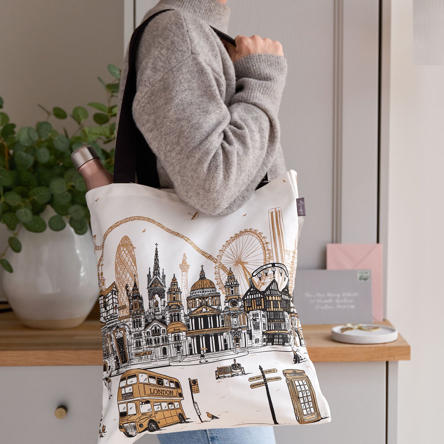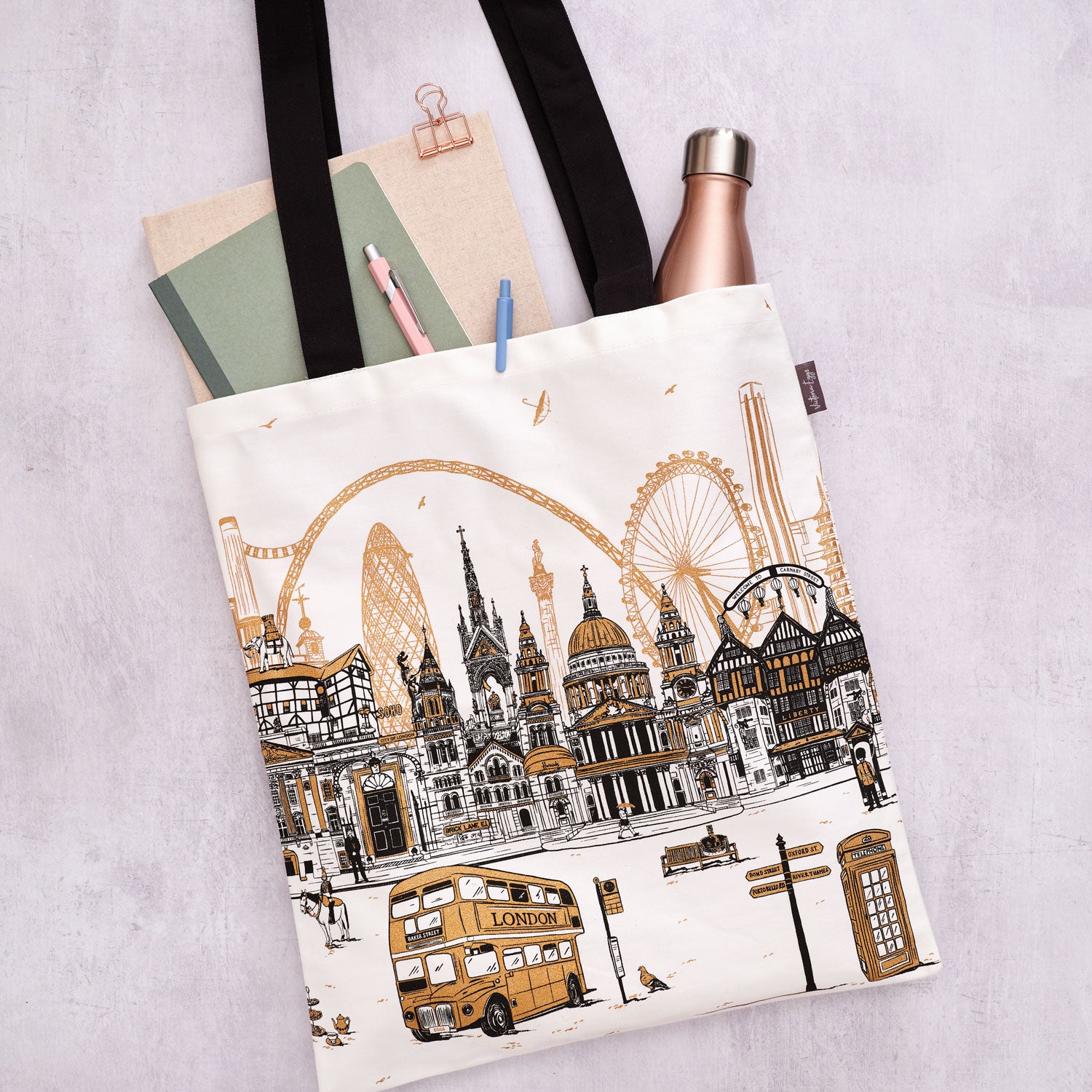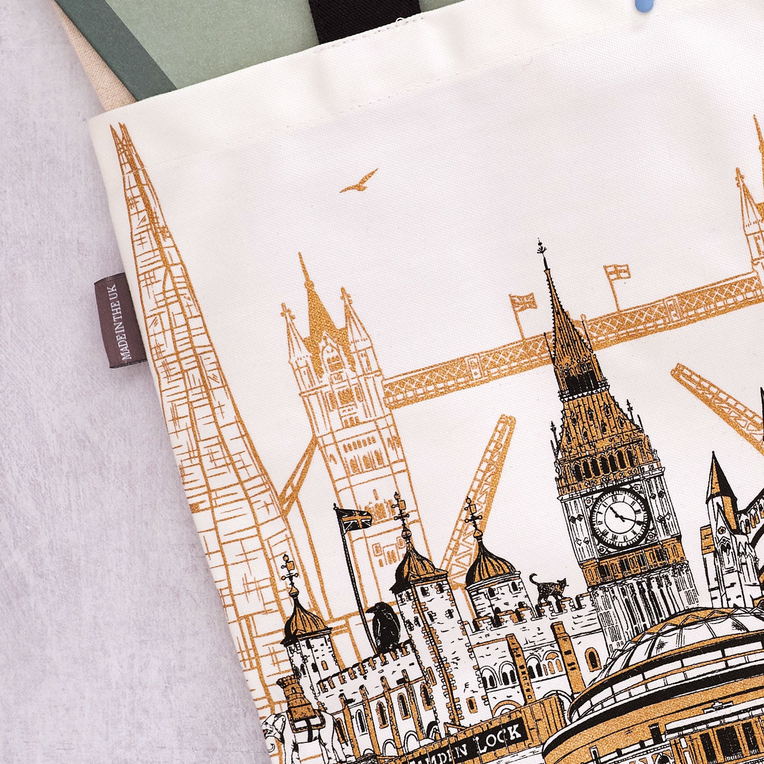 Experience the charm of London with the Quintessentially London Canvas Bag from Victoria Eggs. Each side features a unique design, showcasing the city's iconic landmarks and hidden gems. Handmade in the UK, this bag is crafted from unbleached canvas and measures approximately 38 x 43 cm.