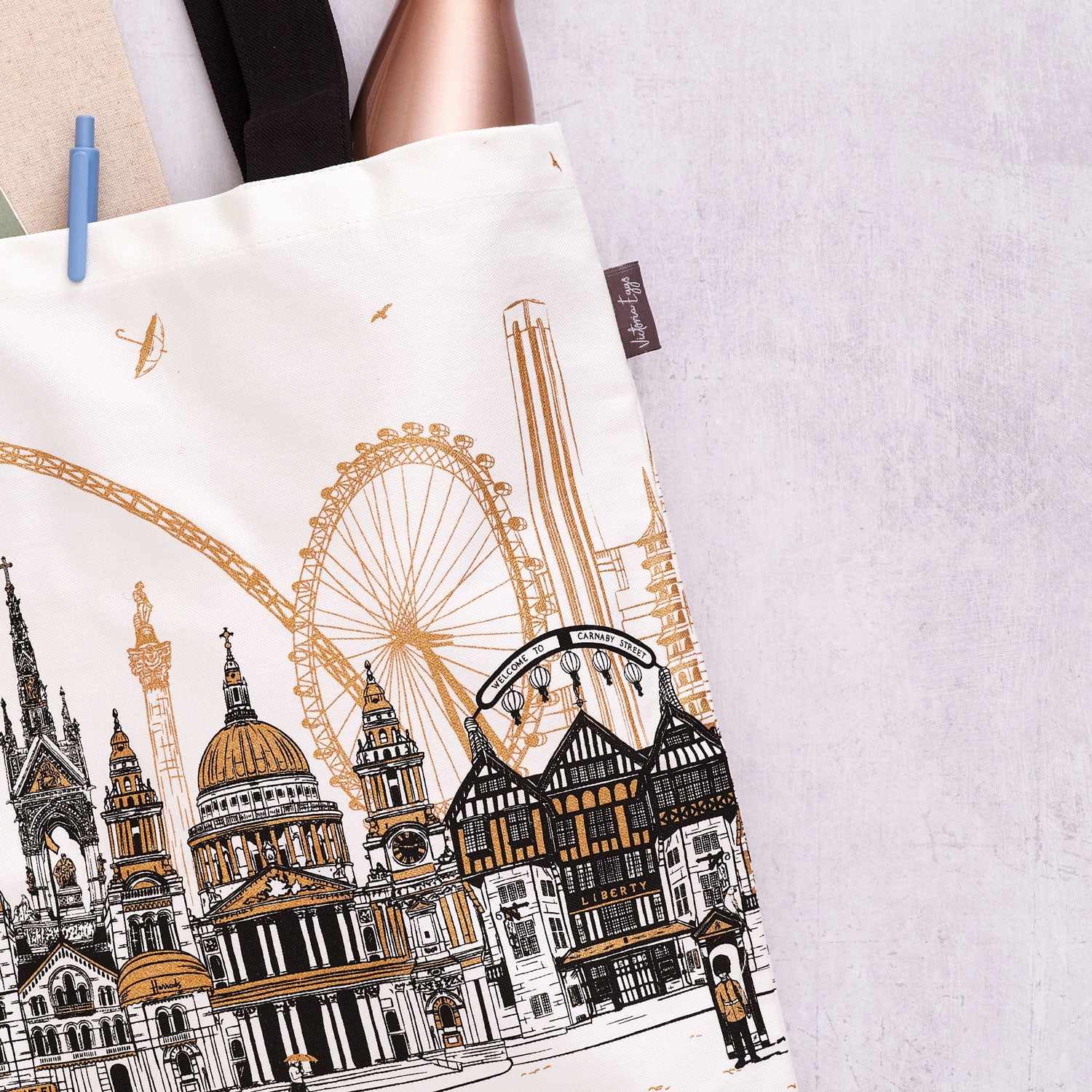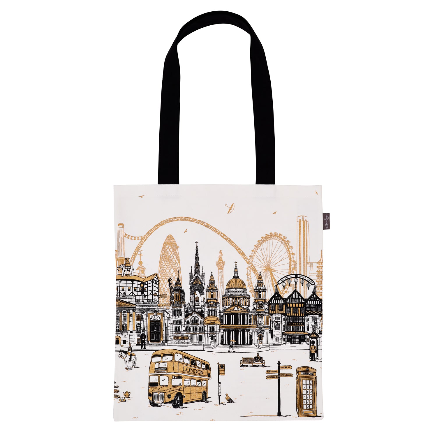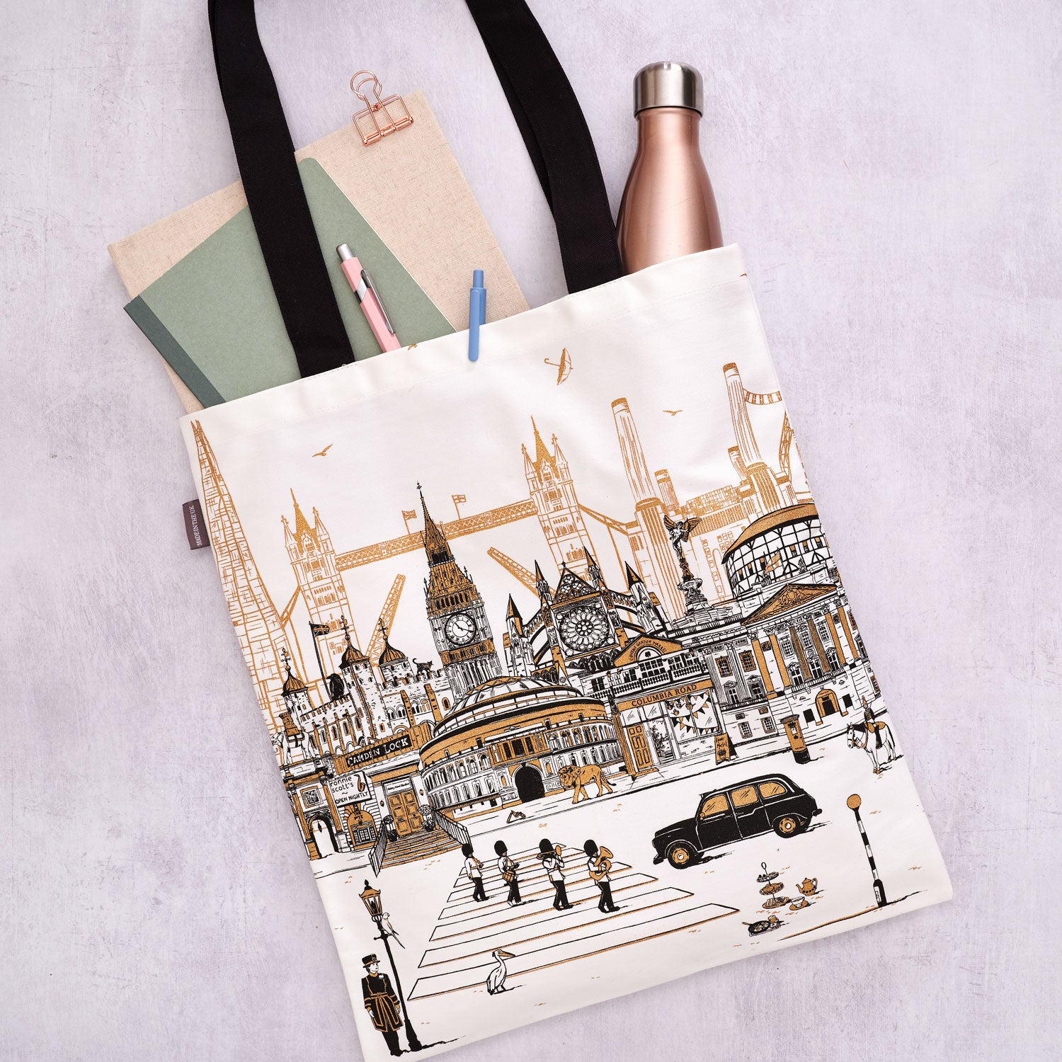 Experience the charm of London with the Quintessentially London Canvas Bag from Victoria Eggs. Each side features a unique design, showcasing the city's iconic landmarks and hidden gems. Handmade in the UK, this bag is crafted from unbleached canvas and measures approximately 38 x 43 cm.