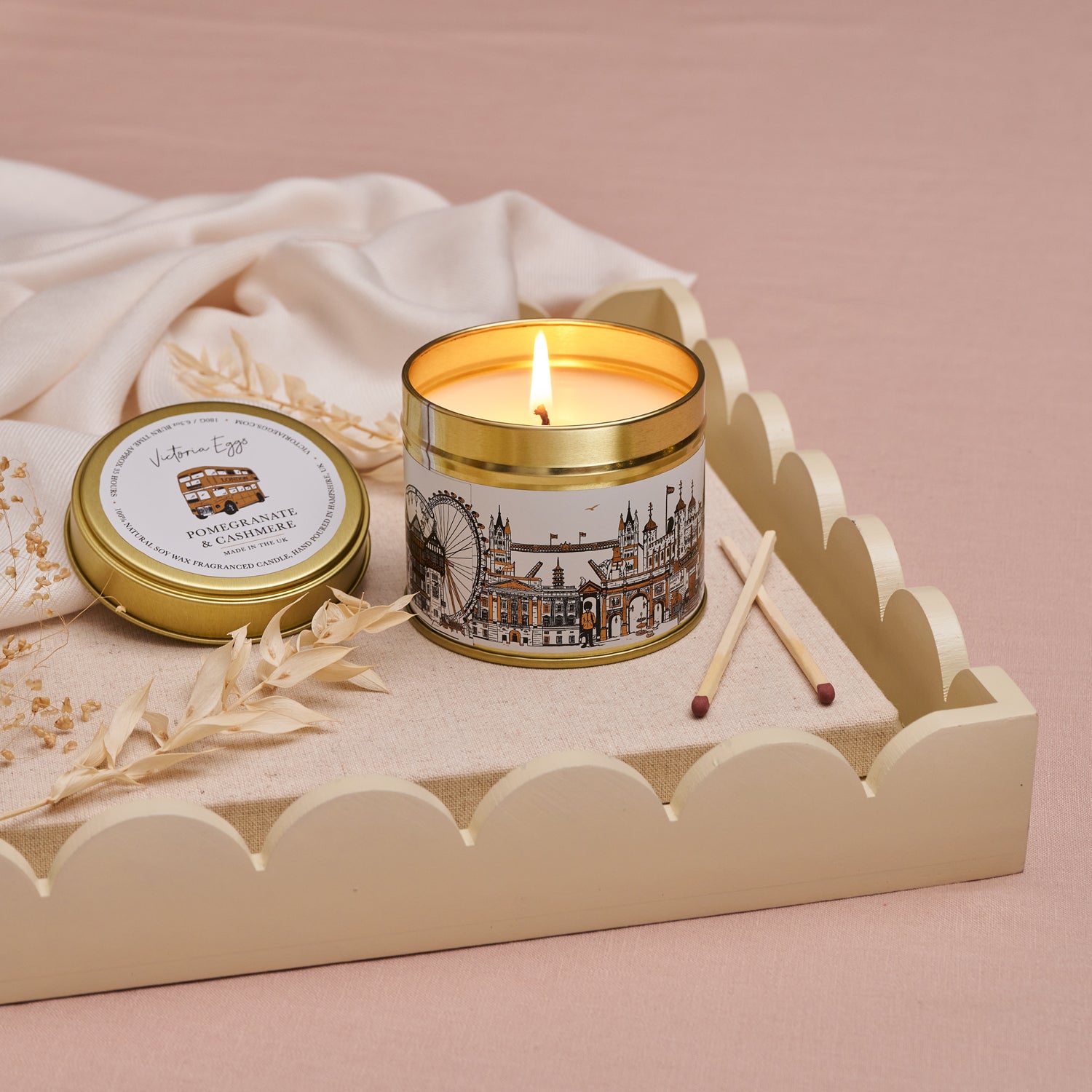 Immerse yourself in your beloved city with the Quintessentially London Tin Candle from Victoria Eggs, featuring intricate details and hidden gems among iconic landmarks. Hand-poured in Britain, our 100% natural soy wax candle is presented in a matte gold tin with a lid and exudes a fragrance blend of mandarin, pomegranate, patchouli, incense, cashmere, musk, and woody base notes. Crafted by expert chandlers in Hampshire, UK, this candle has a burn time of approximately 35 hours.