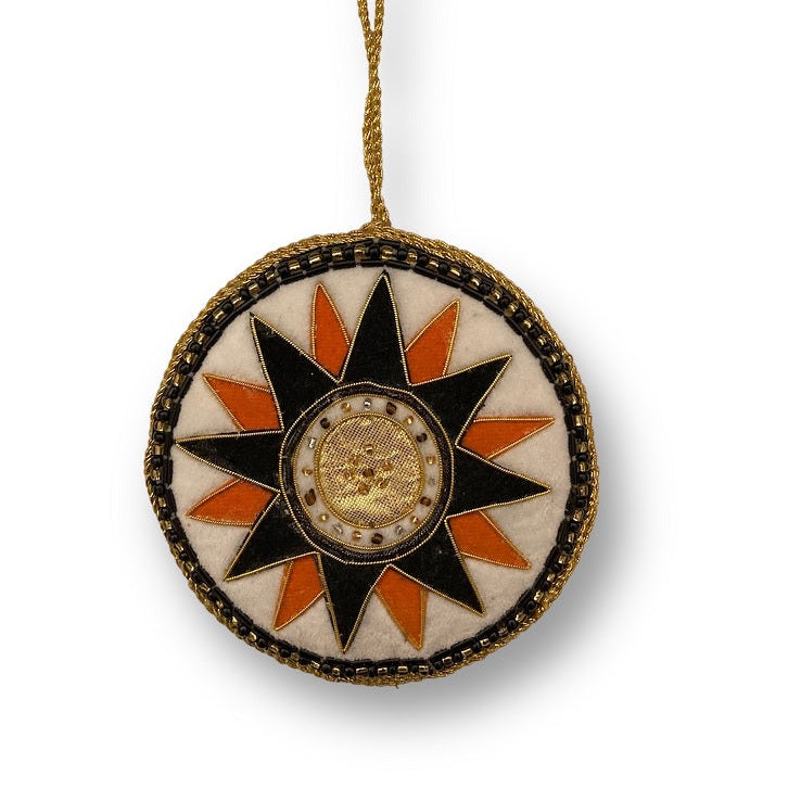 Inspired by the stunning floor design beneath the cathedral’s dome, this exquisite Sunburst Roundel is a celebration of artistry and craftsmanship. Handcrafted using glass beads and gold-coloured threads, it features an elegant two-tone velvet background that enhances its rich, intricate detailing.