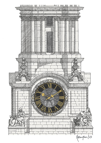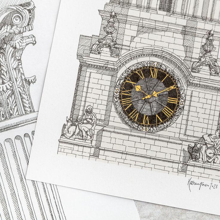 Artist and architect Katherine Jones has created a stunning series of prints of St Paul's Cathedral, this is the clock on the south west tower of the cathedral as viewed from the iconic west front of St Paul's Cathedral. Using a combination of pens and watercolours, each illustration features intricate detail and accuracy.