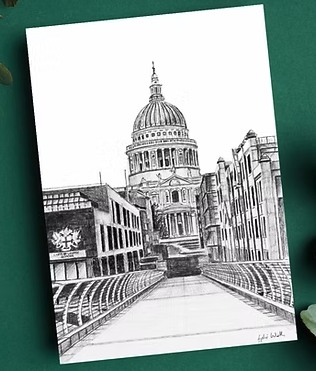 Sophie’s favourite of all Christopher Wren’s churches in the City of London, St Paul’s Cathedral was a joy to draw from every angle. This design captures the iconic view from Millennium Bridge in a beautifully detailed graphite pencil sketch.
