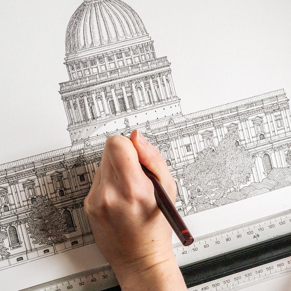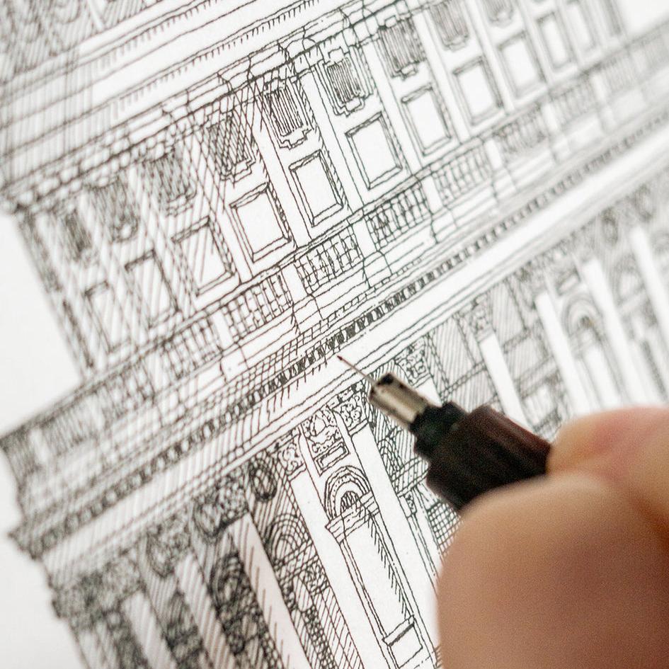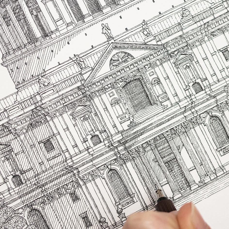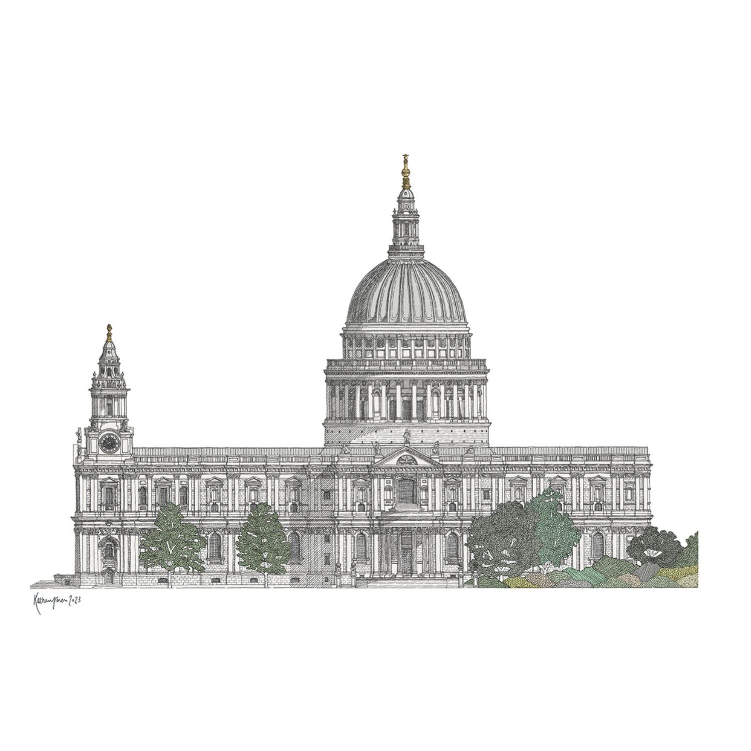 Artist and architect Katherine Jones has created a stunning series of prints of St Paul's Cathedral, this is the south elevation as seen from the Millennium Bridge; Katherine has added the trees and bushes to soften the architectural landscape. Using a combination of pens and watercolours, each illustration features intricate detail and accuracy.