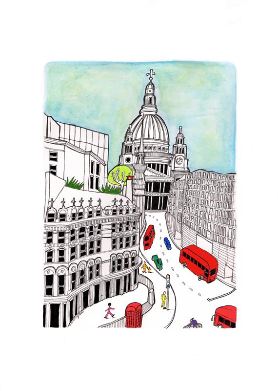 View of St Paul’s from Fleet Street/Ludgate Circus, 2025 is a contemporary response by artist Euan Cunningham to a painting created by his father, Sandy Cunningham, in 1967. In this piece, Euan set out to revisit the same location and perspective his father once painted, creating a poignant dialogue between past and present.