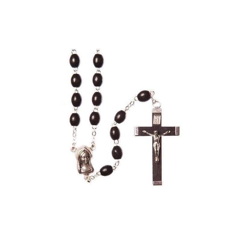 This traditional wooden bead rosary is beautifully made with round beads and features a metal and wood crucifix along with an Our Lady centrepiece. Crafted with strong metal wire links for durability, it is ideal for regular use in prayer and devotion.