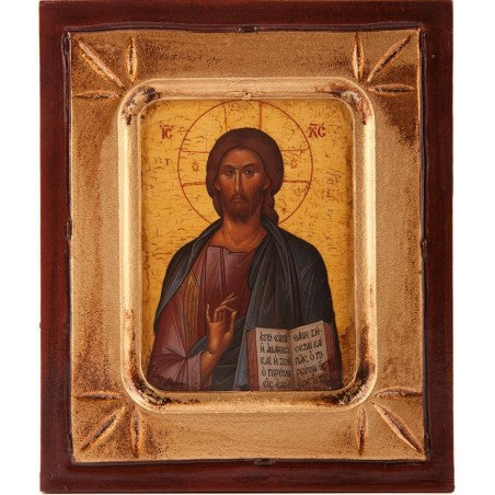 This is a traditional Byzantine icon reproduction crafted from wood in Greece, featuring a wax stamp on the back for authenticity. It can be displayed by hanging it from the cord on the back or used as a freestanding piece.