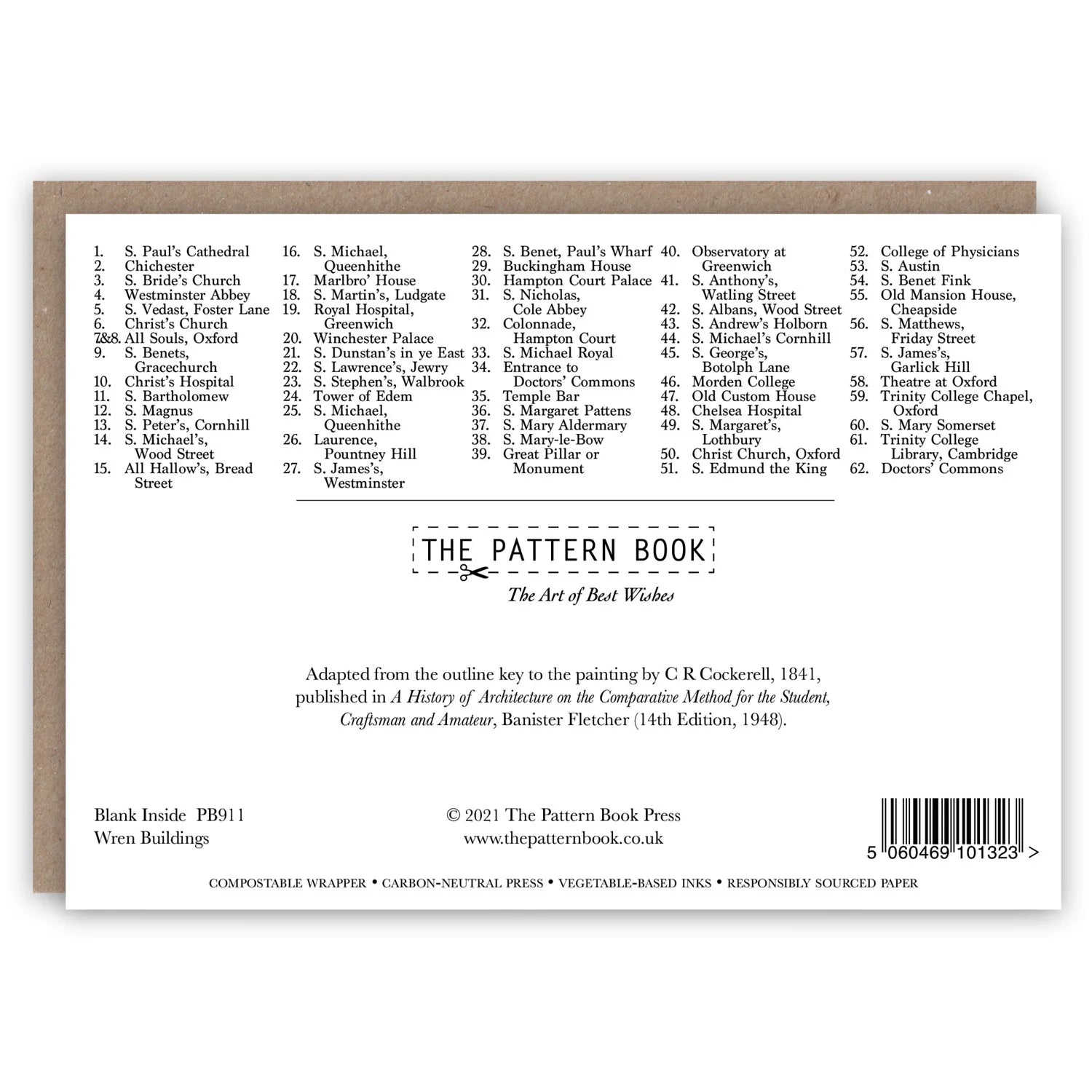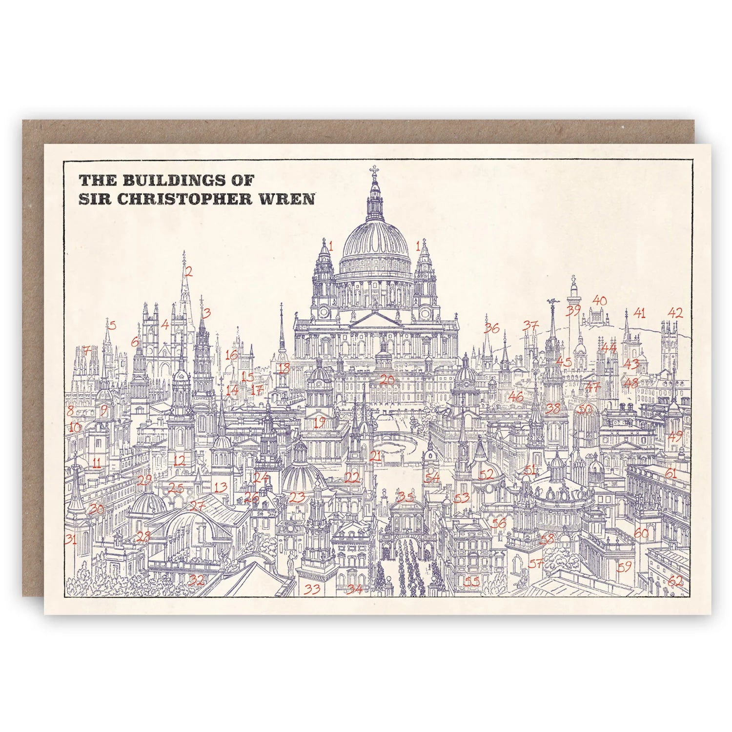 A striking greetings card featuring Christopher Wren’s iconic buildings, adapted from the 1841 outline key by C. R. Cockerell. A detailed key is printed on the reverse.